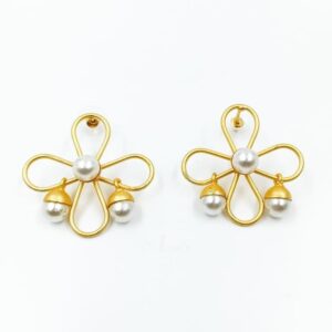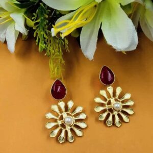 ARNAS 1 PAIR GOLDEN BRASS METAL WITH LOOK ALIKE PEARL & MONALISA STONE FLORAL MOTIVE EARRINGS