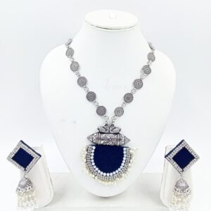 FABRICJ0007- ARNAS COMBO SET OF BLUE FABRIC SEMI ROUND MOTIF PENDANT & SQUARE MOTIF EARRINGS WITH ATTRACTIVE DESIGN