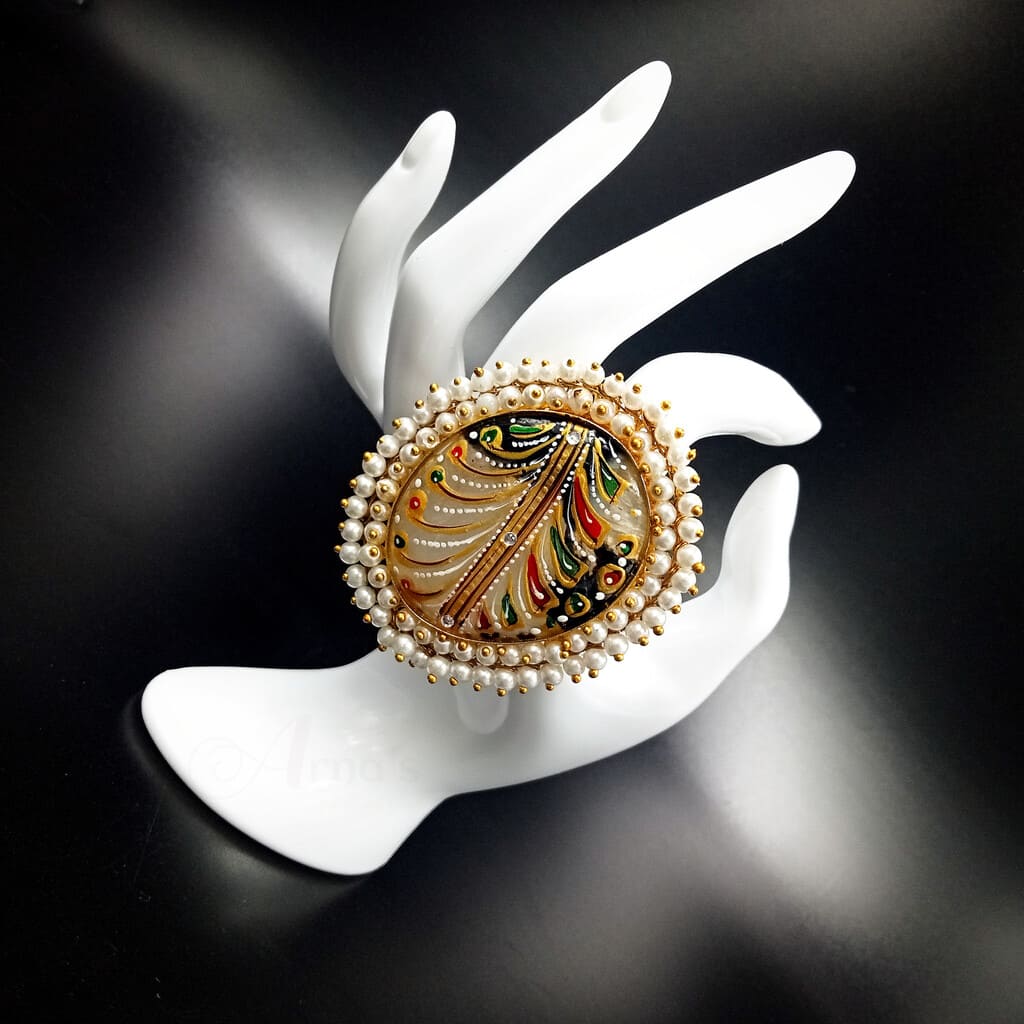 1 PC TANJOR PAINTING | HAND PAINTED ON SEMI PRECIOUS STONE GAJRA SILVER FINGER RING