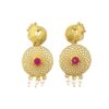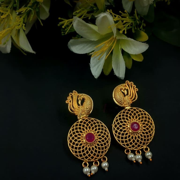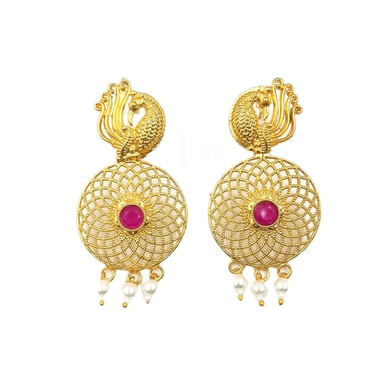 ARNAS 1 PAIR PACK OF GOLDEN BRASS METAL WITH MAGENTA STONE DESIGNER ROUND BIRD MOTIVE EARRING