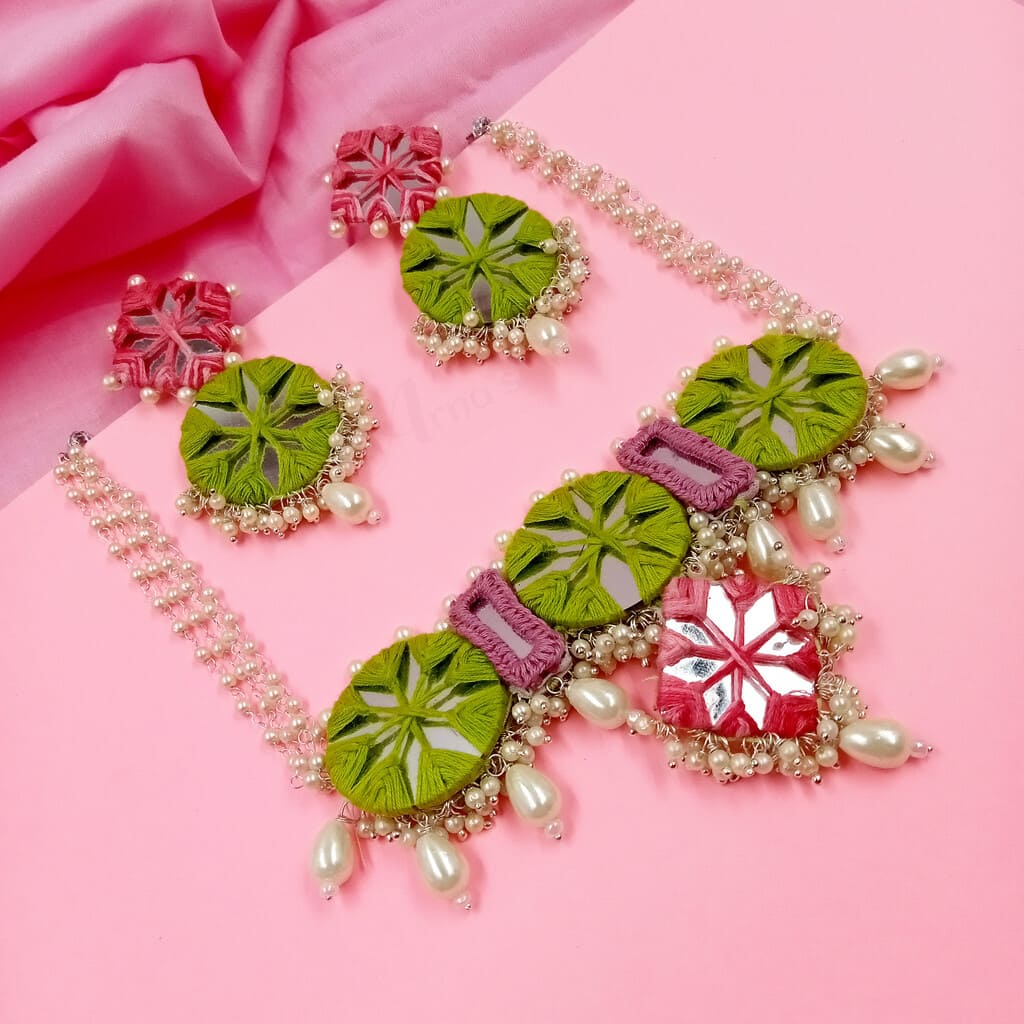 ARNAS GREEN PREMIUM QUALITY MEENAKARI BRIDAL KUNDAN NECKLACE WITH EARRINGS MANGTIKA SET