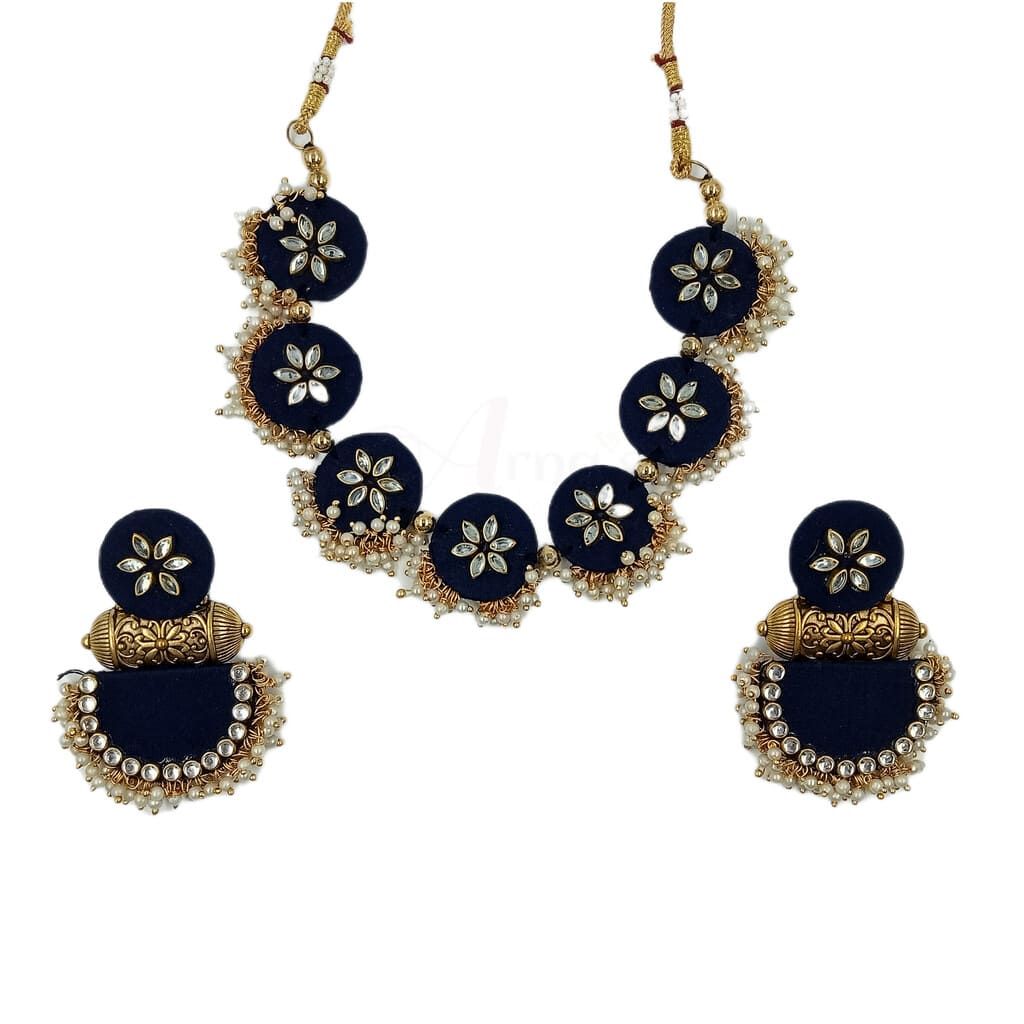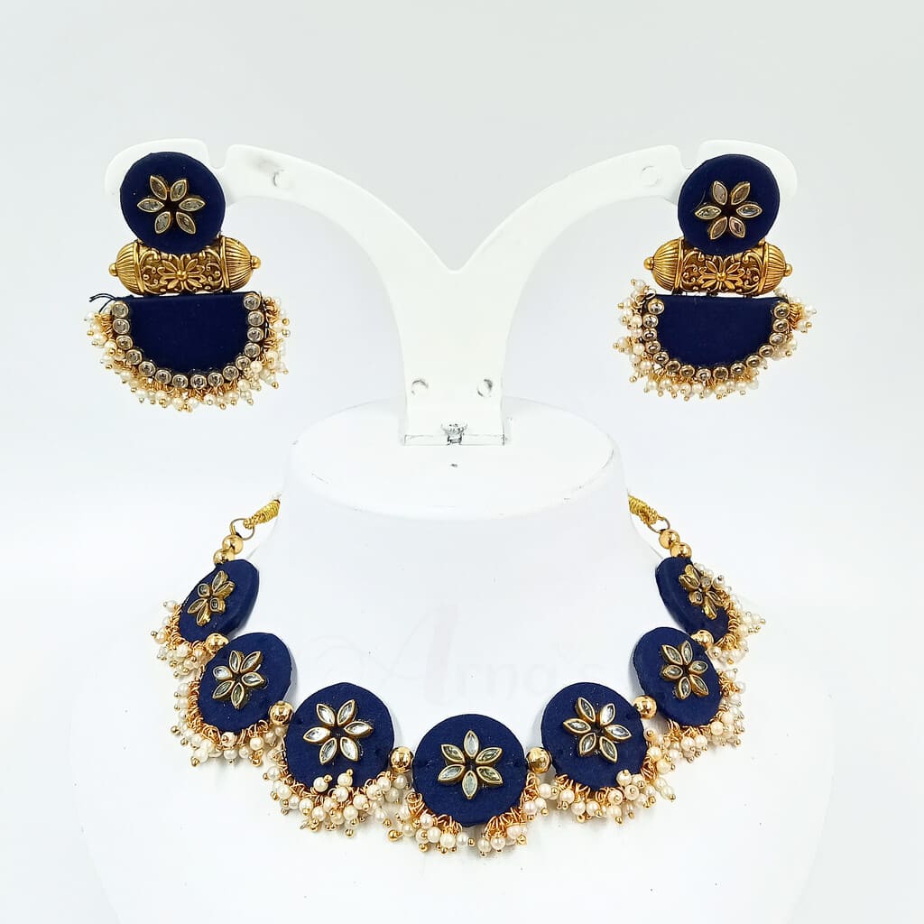 ARNAS MATT GOLD TANJOR PAINTING BLACK SEMI PRECIOUS STONE - STUDED EARRINGS CHOKER NECKLACE SET