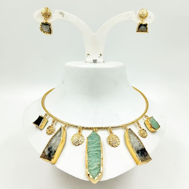 - This jewellery set consists of a necklace and a pair of earrings.
