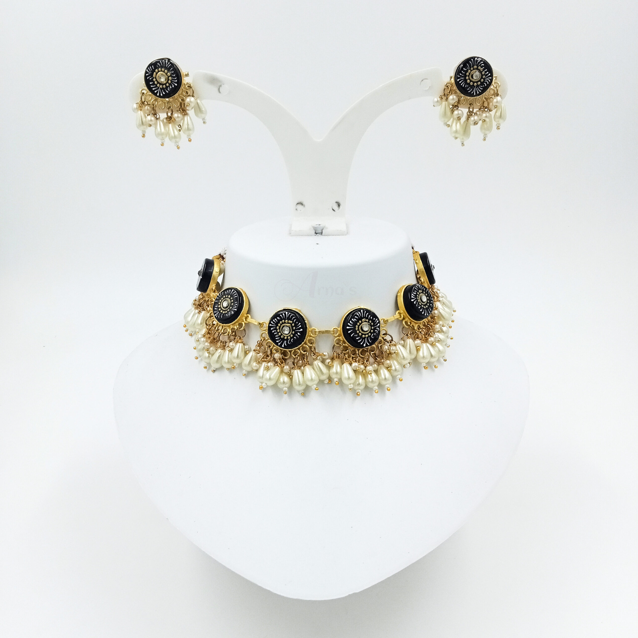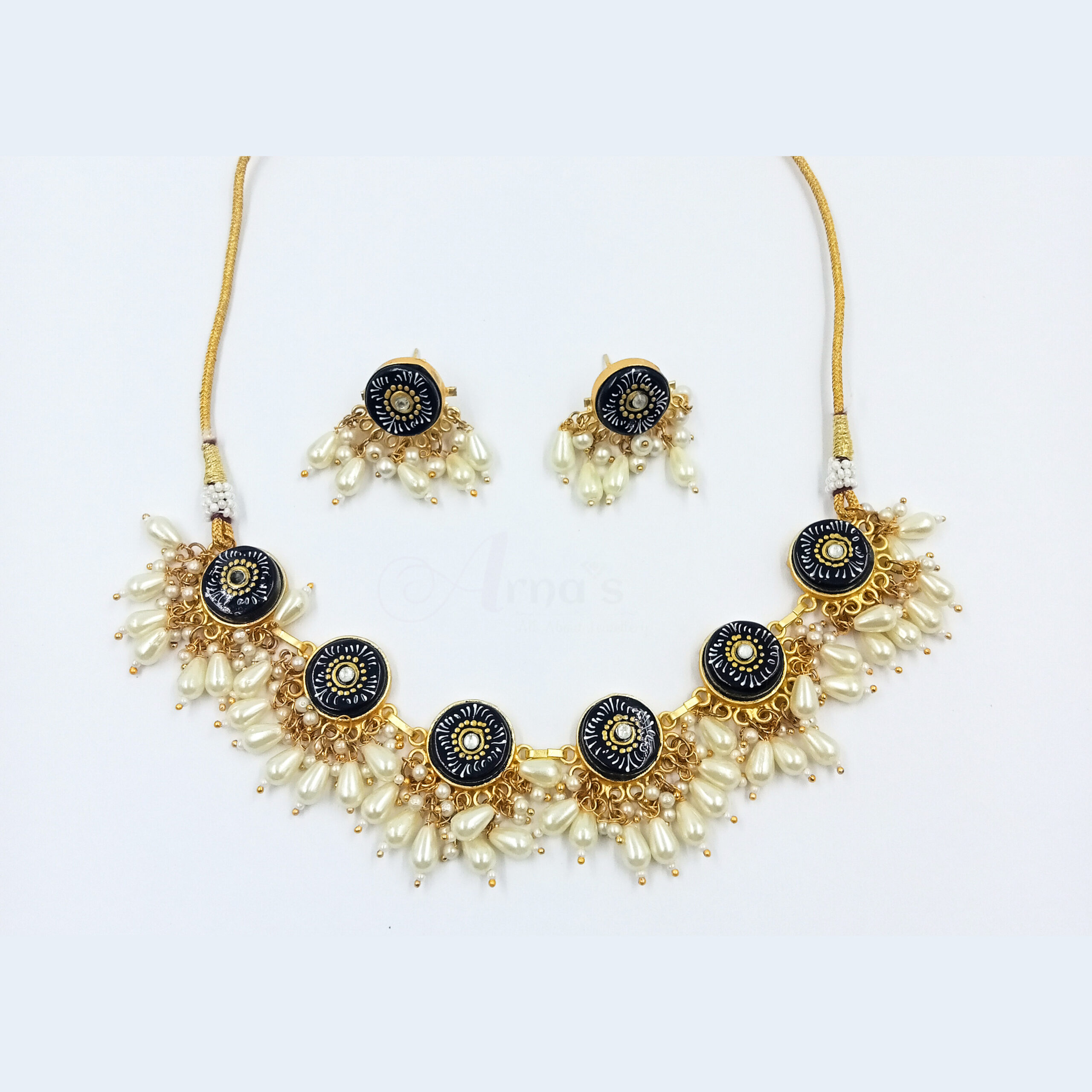 OXINECLASE0014 - ARNAS HANDCRAFTED SILVER & BLACK BEADS WITH OXIDIZED GERMAN SILVER LEAF MOTIVE PENDENT JEWELLERY SET