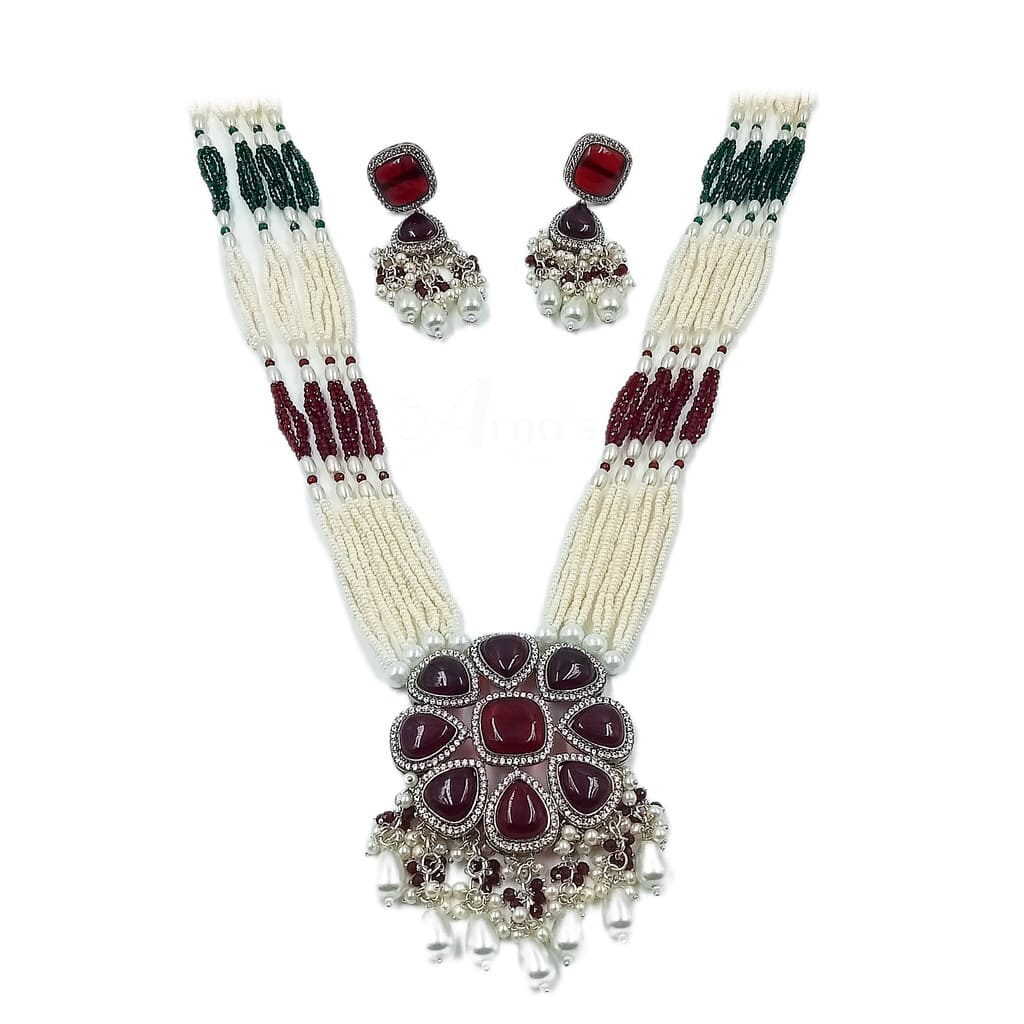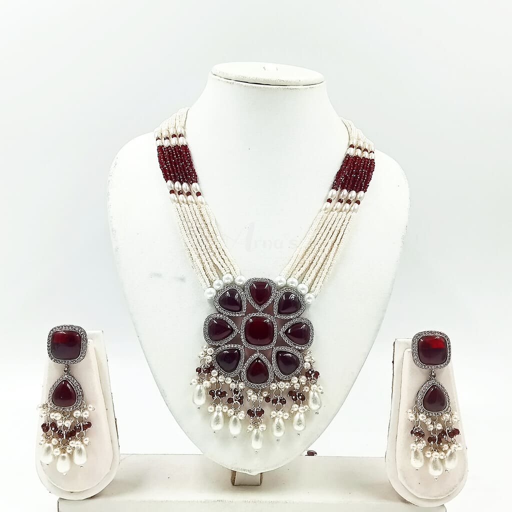ADNECK0005- ARNAS GOLD PLATED RUBY RED AMERICAN DIAMOND NEKLACE SET