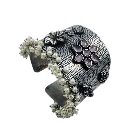 1 PC LOOK ALIKE PEARL BLACK FLORAL MOTIVE ADJUSTABLE SILVER FINGER RING