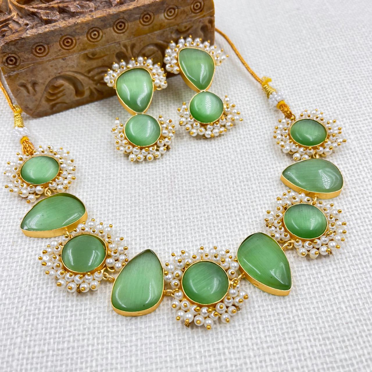 GOLDEN GAJRA NECKLACE SET WITH PISTA GREEN MONALISA STONE