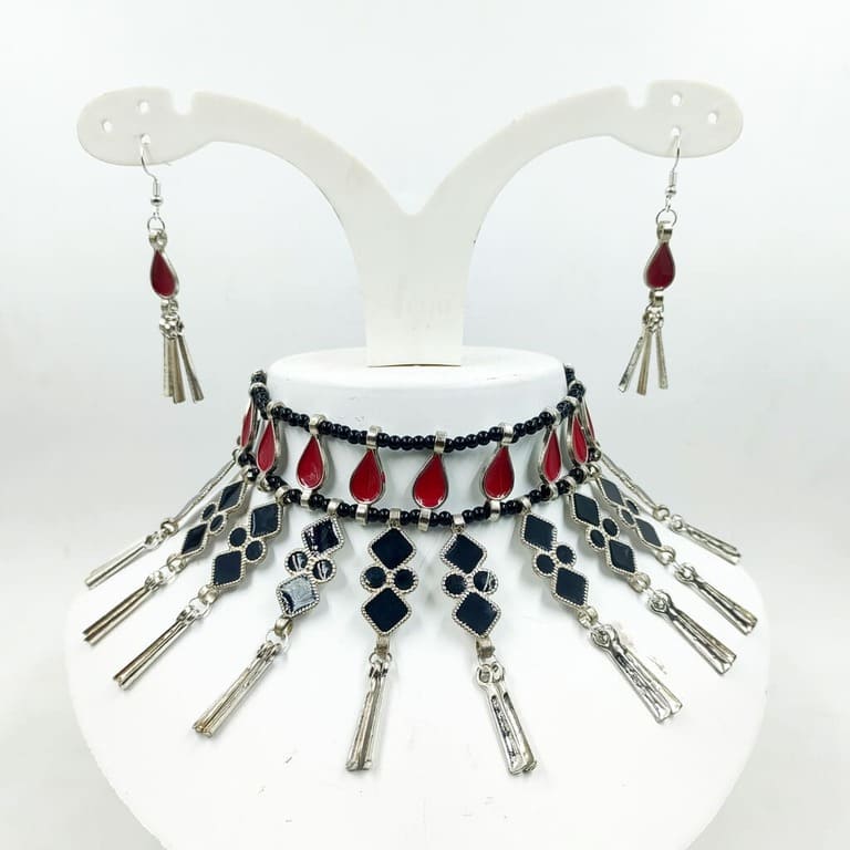 - This jewellery set consists of a necklace and a pair of earrings.