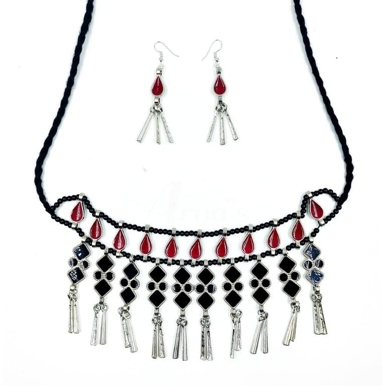 OXINECLASE0014 - ARNAS HANDCRAFTED SILVER & BLACK BEADS WITH OXIDIZED GERMAN SILVER LEAF MOTIVE PENDENT JEWELLERY SET
