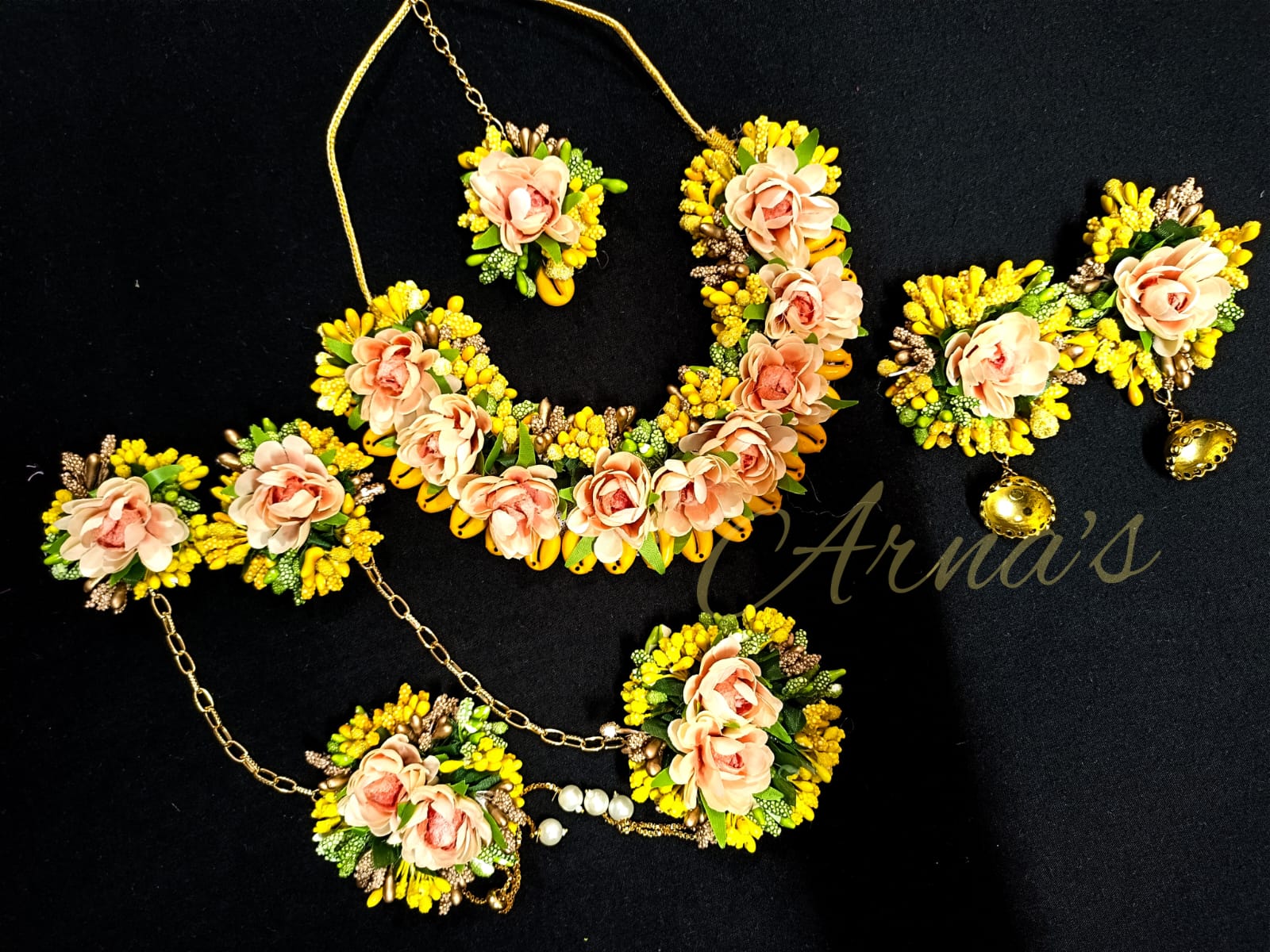 FABRICJ0023- NECKLACE-EARRINGS-MANGTIKKA-HANDCRAFT-RING YELLOW FLORAL HALDI JEWELLERY